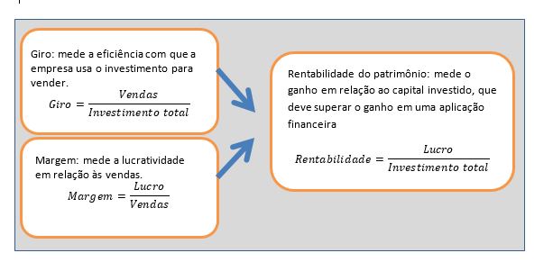 Já o giro é uma medida de eficiência, que procura verificar se a empresa vende o bastante diante do investimento total realizado. Se o investimento total é de R$ 100 mil e as vendas são de R$ 50 mil, então a empresa gira 50% do seu investimento ao mês, ou seja, gira seu investimento total em dois meses. A figura a seguir demonstra as fórmulas e a relação entre margem, giro e rentabilidade.